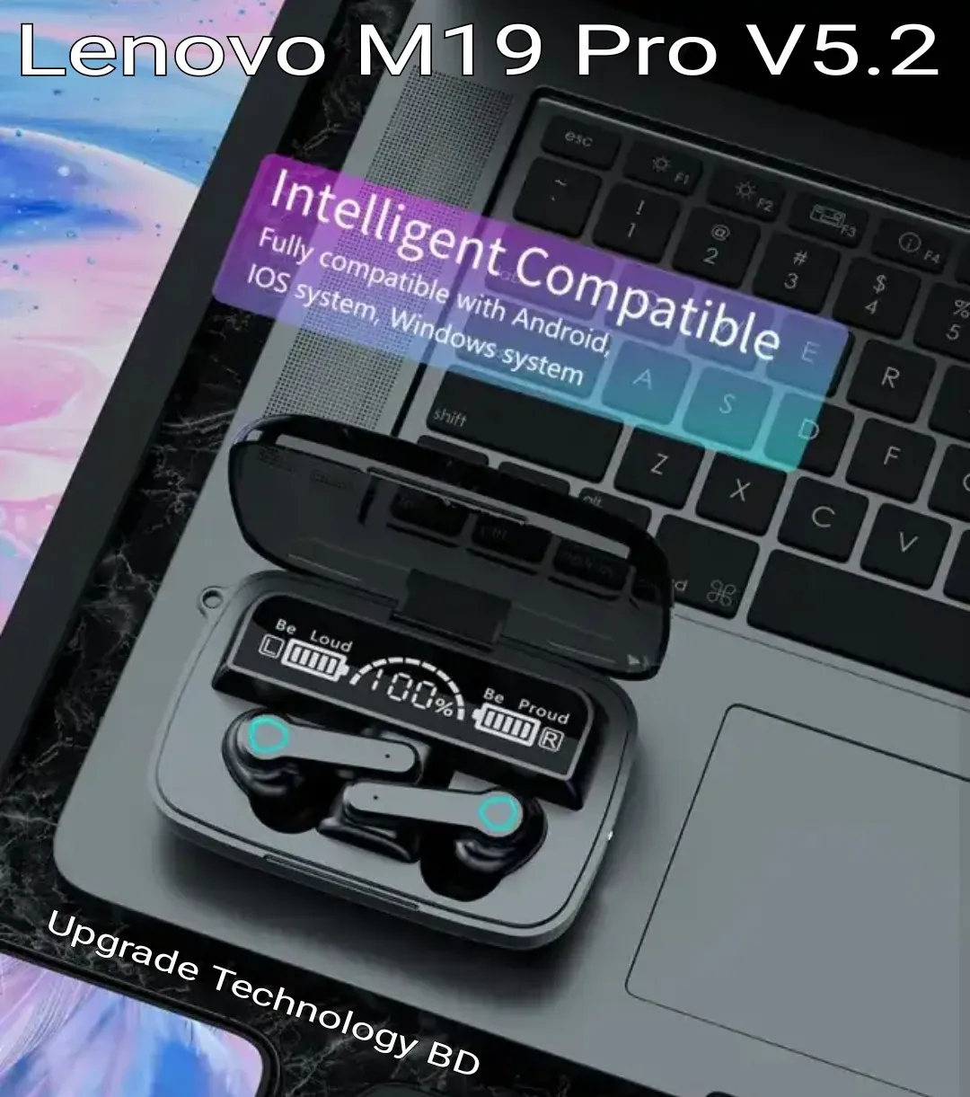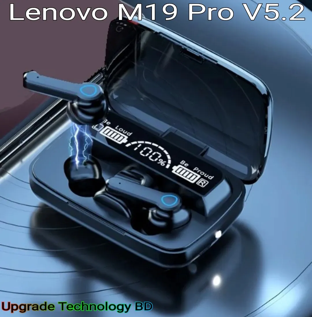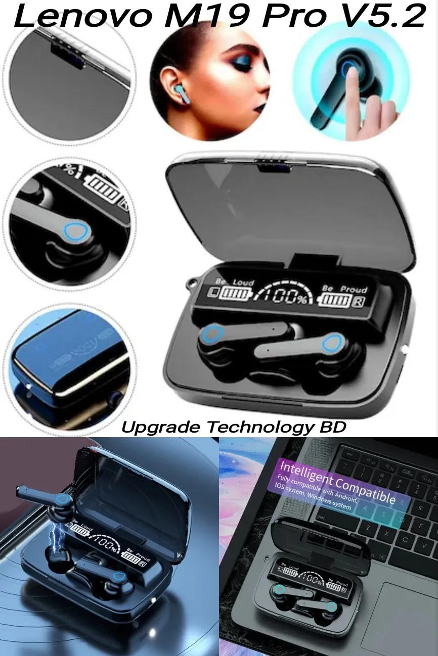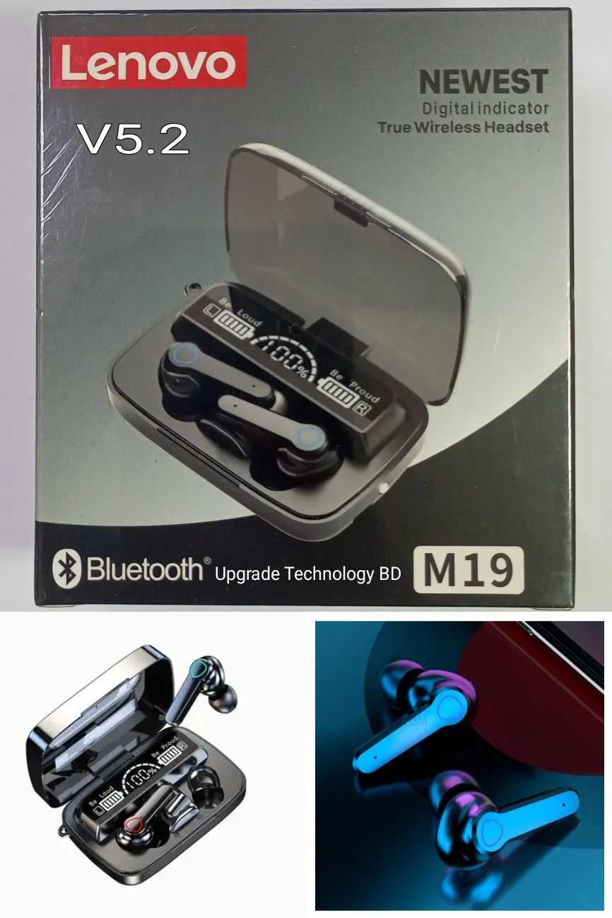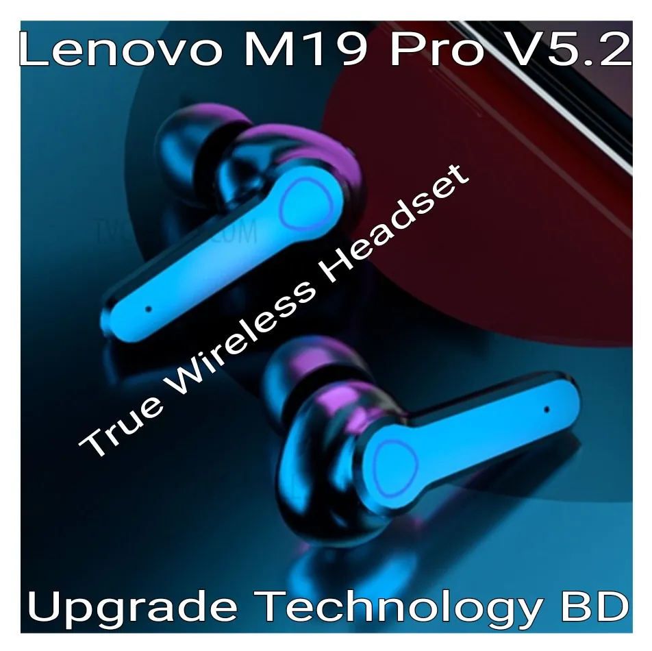 • Designed for a more comfortable fit The 5.2 chip manages battery life very well. Using CVC8.0 (NO digital noise reduction technology). Wireless connections Bluetooth: 5.2. Lenovo M19 Pro Wireless Bluetooth Earbuds TWS Earphone Wireless Bluetooth 5.2 Touch Control Headphones With Mic Waterproof With Flashlight Function. Wireless Bluetooth earphone: waterproof and sweat-proof. Exercise without sweat. Lenovo TWS M19 Pro Air-pod same as M19 Wireless Bluetooth 5.2 Earbuds Finger Touch Control - LED Display lights Sport Earphones Headphones with 2000mAh Battery.