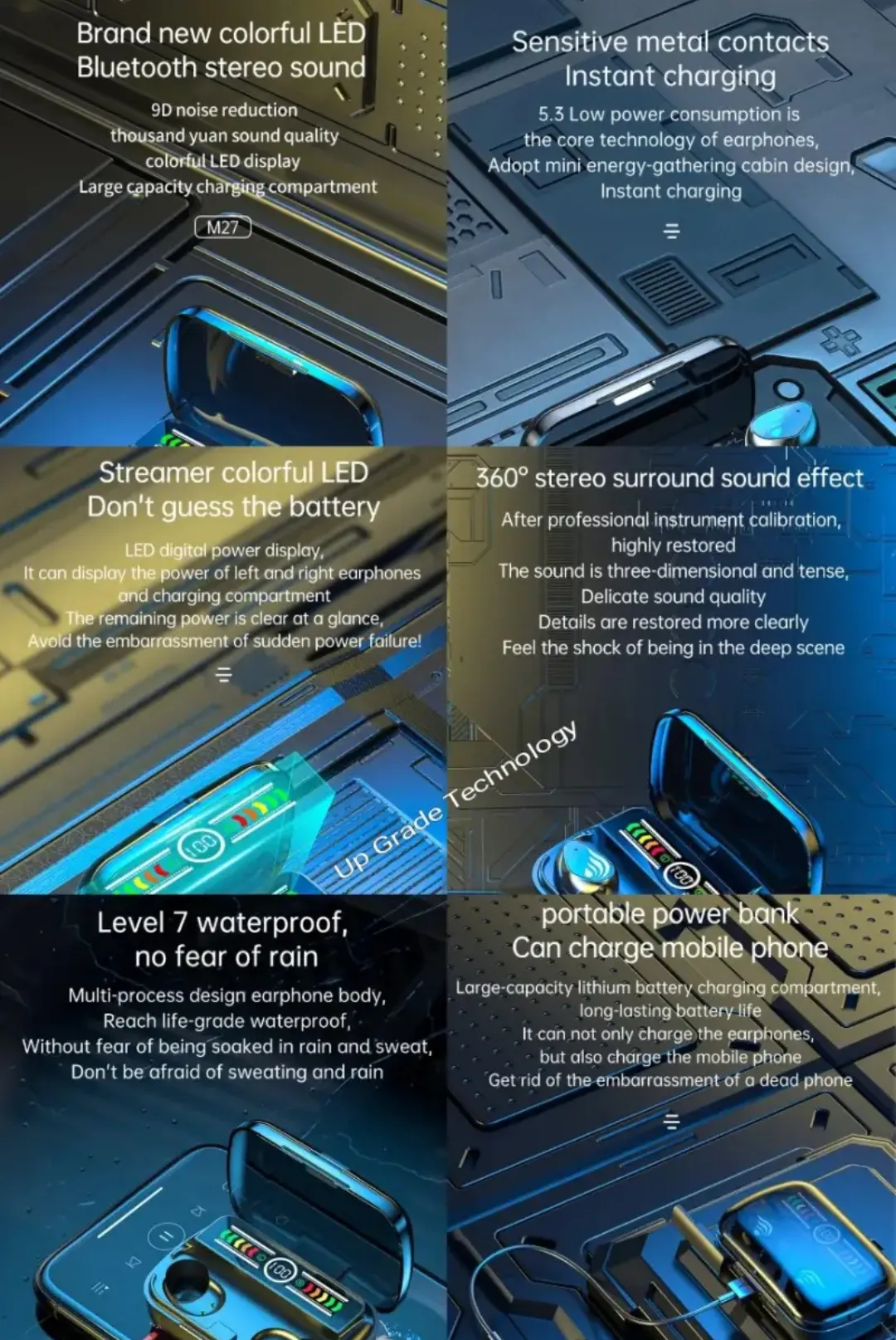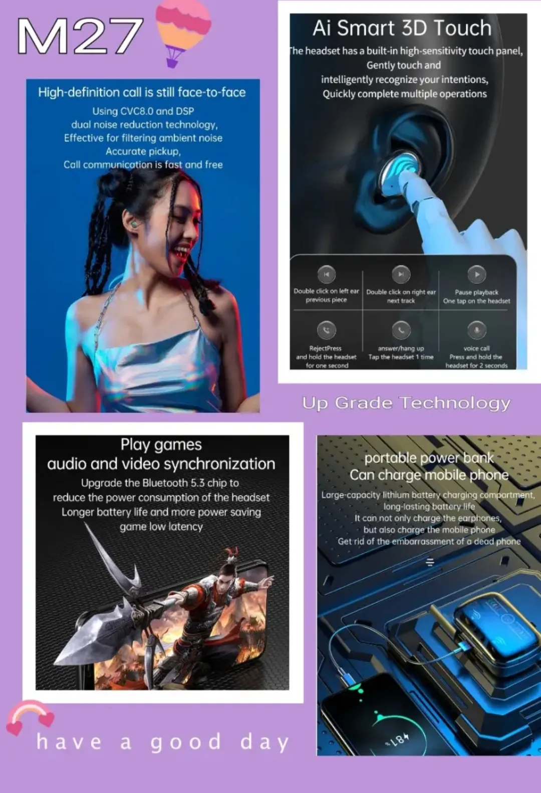 1. The M27 TWS Wireless Bluetooth 5.3 Sports In-Ear Headset is a cutting-edge audio device designed for active individuals who demand high-quality sound while on the move. With the latest Bluetooth 5.3 technology, this headset offers seamless connectivity and superior audio performance, allowing you to enjoy your favorite music or podcasts without any interruptions.