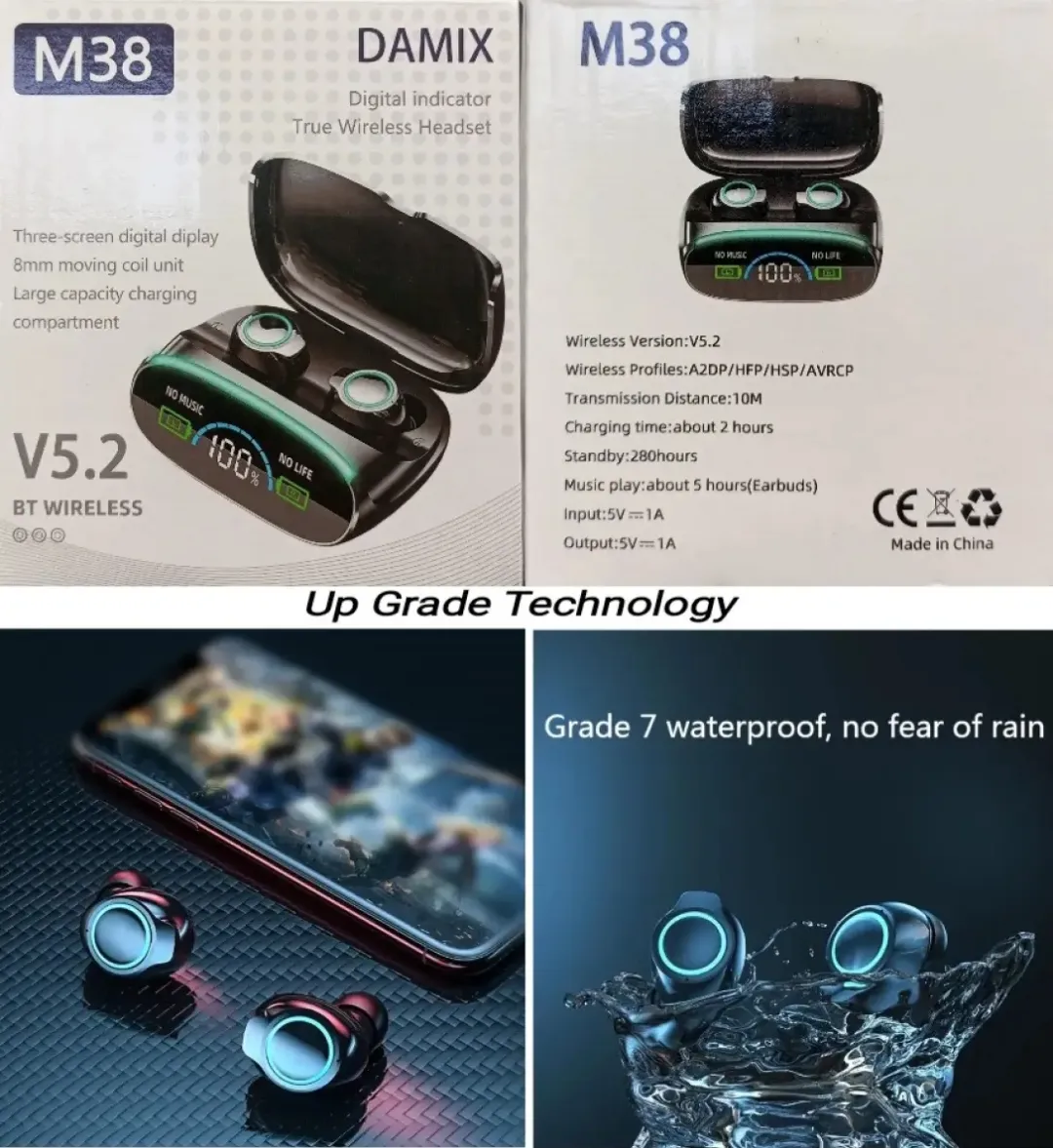 • Product details of: M38 Wireless Earphones Bluetooth V5.2 TWS Wireless Headphones LED Display With Power Bank Headset with Microphone.
