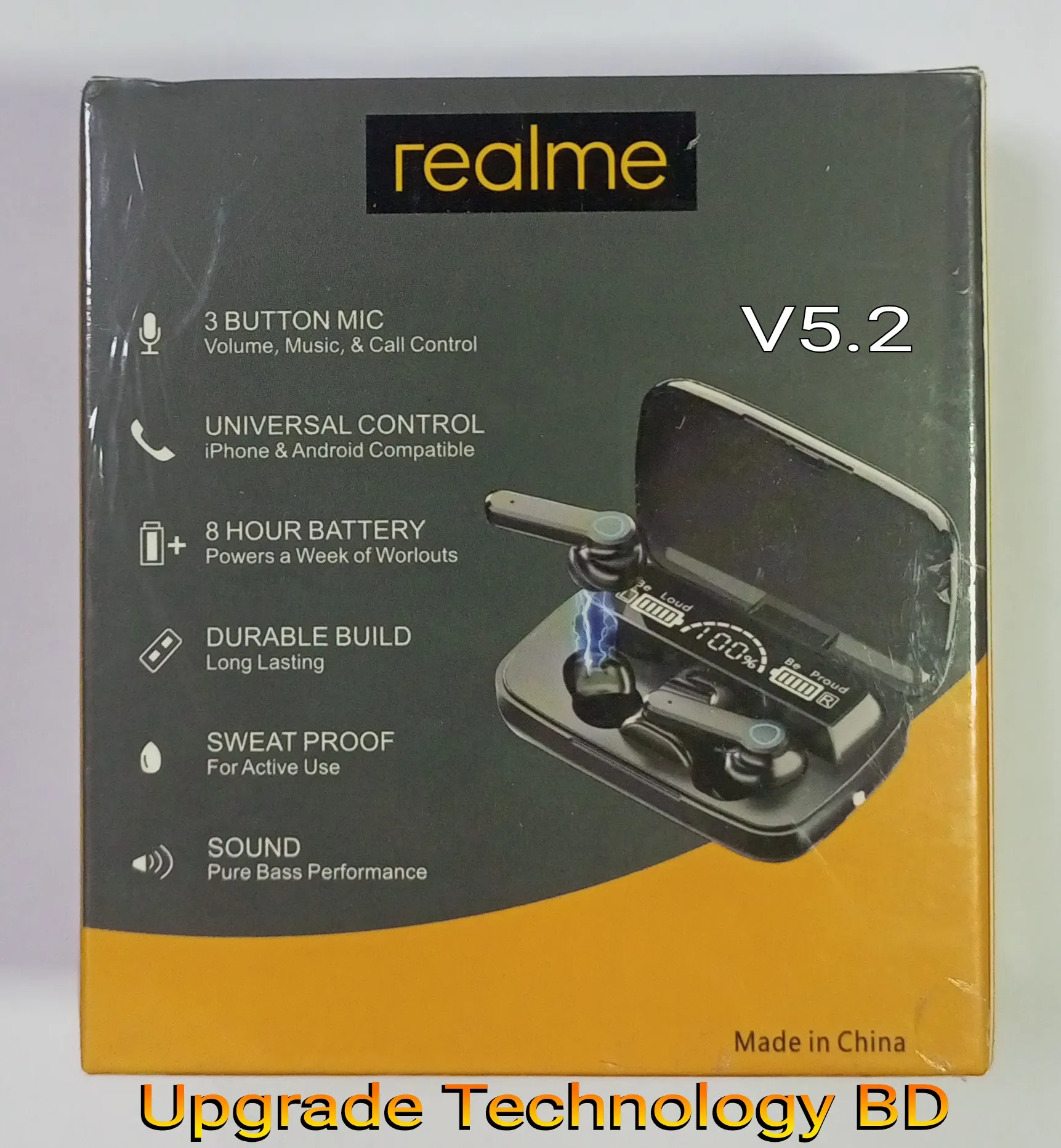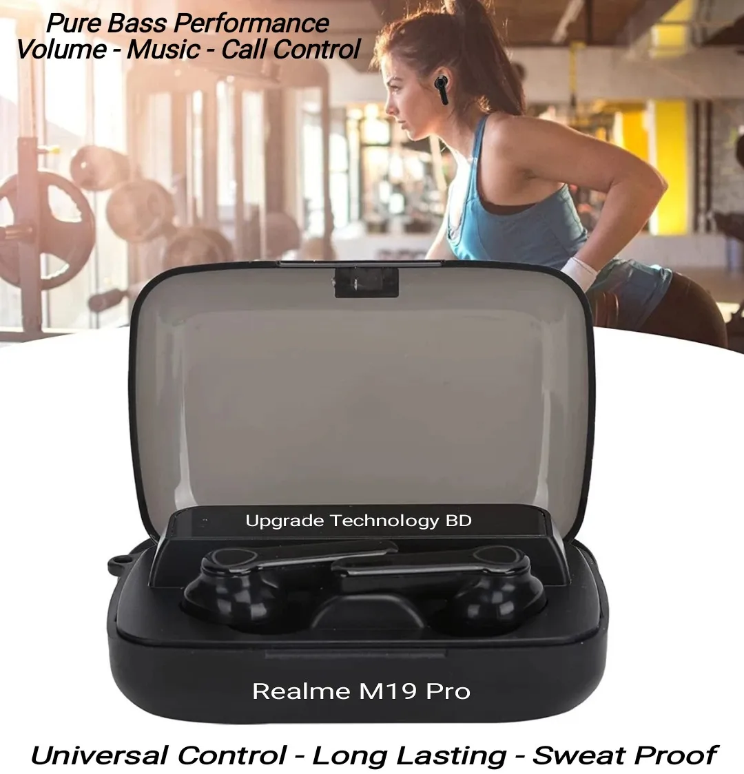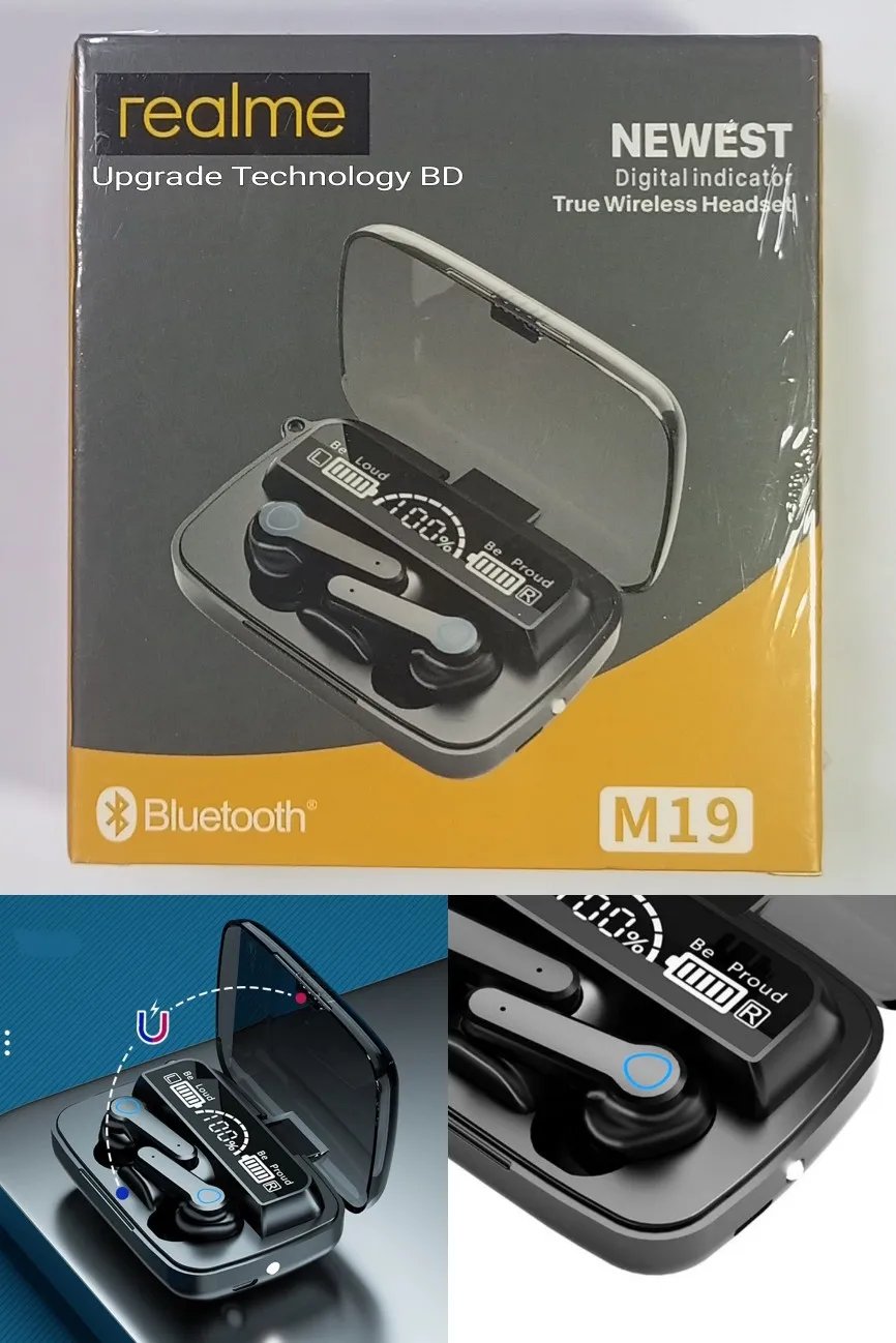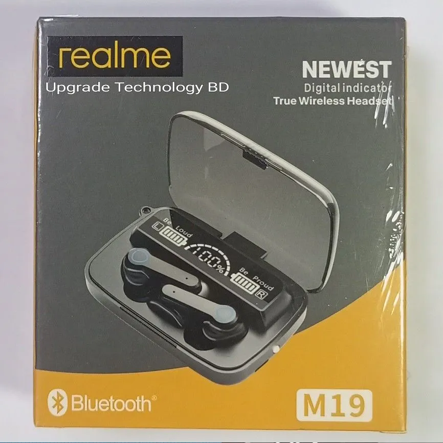 • Designed for a more comfortable fit The 5.2 chip manages battery life very well. Using CVC8.0 (NO Digital Noise Reduction Technology). Wireless connections Bluetooth: 5.2. Realme M19 Pro Wireless Bluetooth Ear-buds TWS Earphone Wireless Bluetooth 5.2 Touch Control Headphones with Mic Waterproof With Flashlight Function. Wireless Bluetooth earphone: waterproof and sweat-proof. Exercise without sweat. Realme TWS M19 Pro Air-pod same as M19 Wireless Bluetooth 5.2 Ear-buds Finger Touch Control - LED Display lights Sport Earphones Headphones with 2000mAh Battery.